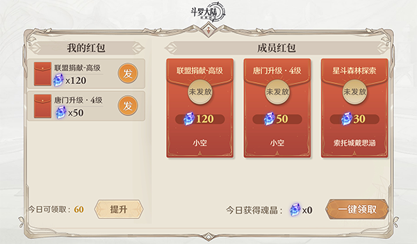 在联盟成员进行高级捐献、升级唐门、探索玩法等节点时,可通过联盟红包领取魂晶。联盟红包每天可领取60次,对于一个活跃联盟而言,将是个比较稳定的魂晶获取途径。