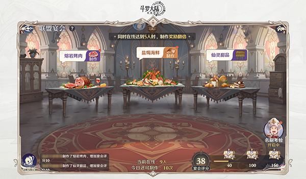 我们可以通过完成全盟捐献任务、联盟商店兑换食材,在宴会界面可以用食材来做三种不同的料理。食物制作后,全体成员都可进行品尝获取联盟贡献、八音盒、祈福板等奖励。宴会在每日10点-22点可以制作食物,大家一起制作食物可提升宴会的评级,100分可以得到精品礼物箱,160分有魂师召唤券。建议每个盟都定一个固定的时间,让全盟参与、全盟制作食物。宴会是联盟贡献的主要来源(前提是得加一个活跃的联盟),大家每天都记得参与一下。