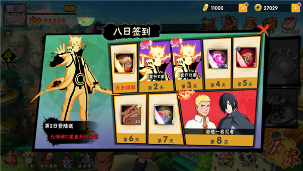 3、【八日登录】首日漩涡鸣人(九喇嘛)直升10星,次日直升11星,三日直升12星,好礼不断!