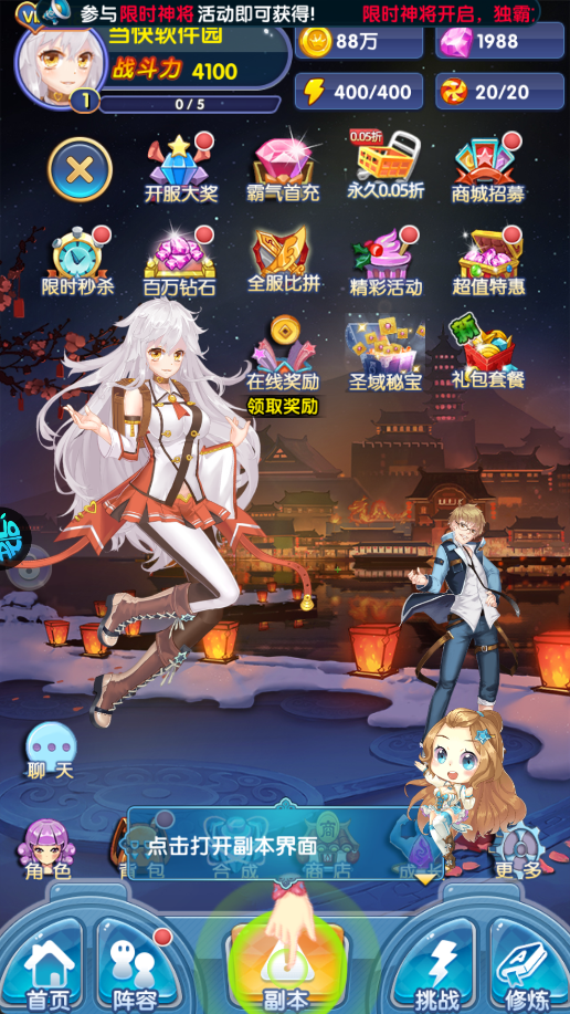 1、新手上线即送0.05折神将大礼包,用“几分钱”即可拥有战力爆表的神级角色,打破传统重氪设定,真正实现“人人皆可高战”。