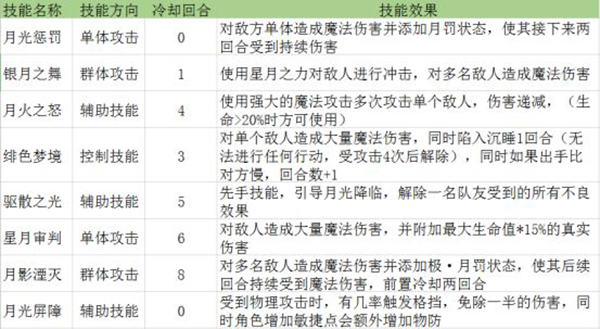 月魂---秉承月之祭司的神术,融合了人类的法术,拥有让敌人陷入沉睡的精神法术,还拥有驱散一切污秽以及异常状态的净化术,神术与魔法的融合带给月魂不俗的战斗能力,月之祭司一族月之神术的特性使月魂能够不动声色的持续消减敌方血量。
