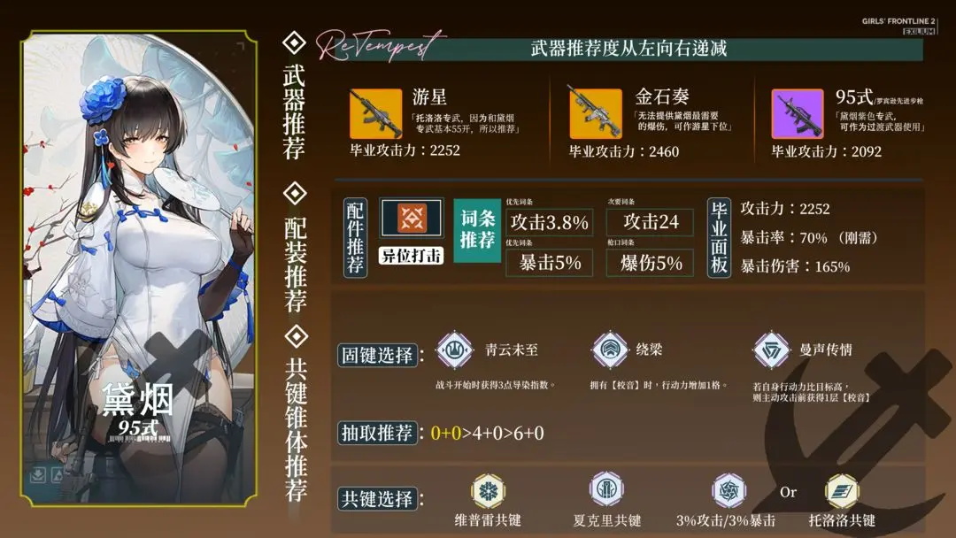 黛烟10+6的超远行动力以及极高的斩杀线,对于平民玩家来说是游戏体验的质变,同时角色造价极低,0椎+游星即可爽玩,对于配件部分中的暴击率需求也不高。加上有伏击的扶持,保证了生存能力的同时有着理想情况下和琼玖单回合伤害相近的上限,但是由于自身约45%的伤害都集中在伏击上,熟练运用黛烟的伏击是用是黛烟伤害最大化的重要因素。角色的共建也可以给其他角色使用,比如腿短的琼玖和wa,各方各面都在发光发热。