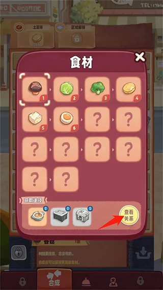 2、进入食材界面,选择【查看关系】选项,