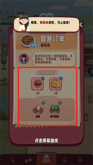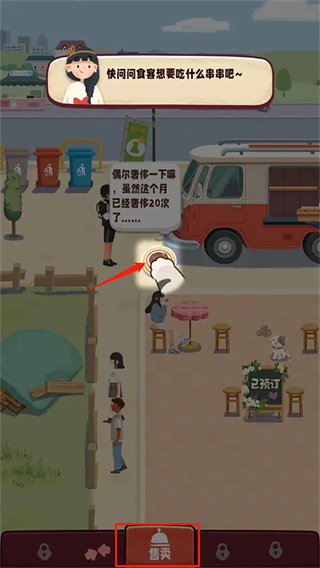 1、打开旅行串串游戏,进入售卖界面,点击顾客上方的【食物】图标,