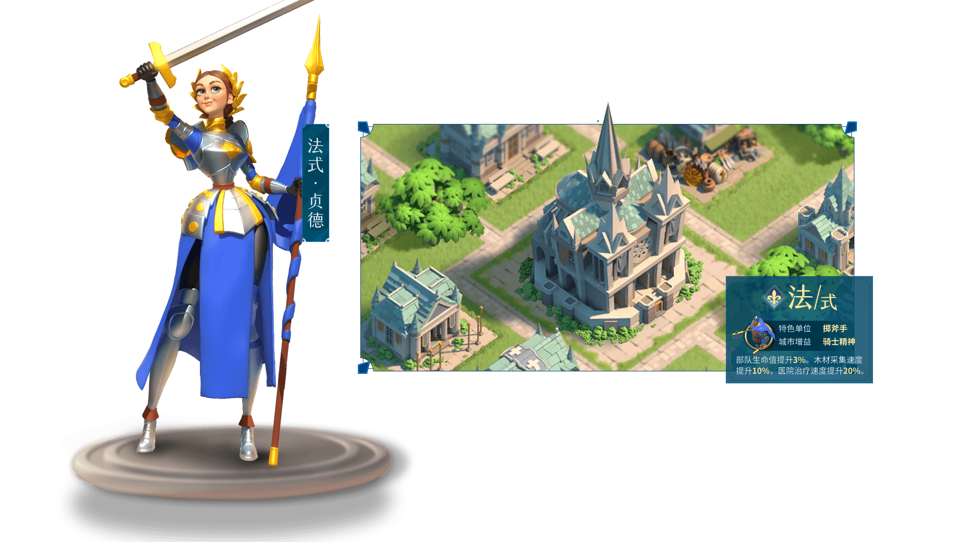 部队生命值提升3%。木材采集速度提升10%,医院治疗速度提升20%。