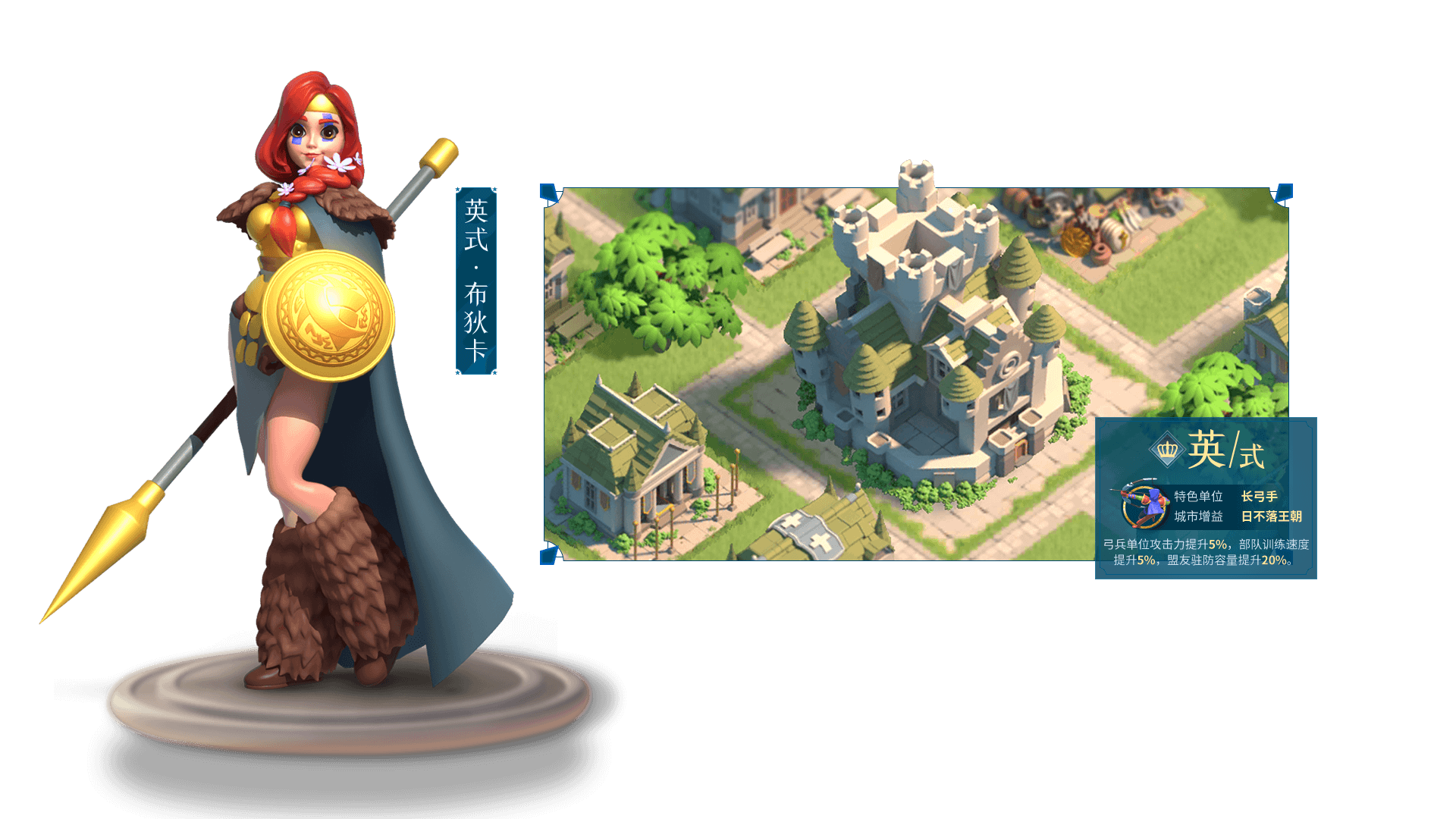 弓兵单位攻击力提升5%,部队训练速度提升5%,盟友驻防容量提升20%。