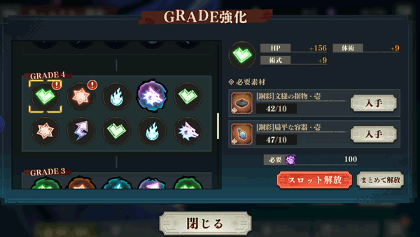除了单纯的等级提升,还可以对角色进行GRADE强化。这种方式需要消耗关卡掉落的专属材料,不仅能进一步提升基础属性,还能在完成一个阶级后解锁新的等级上限,让角色成长空间更大。