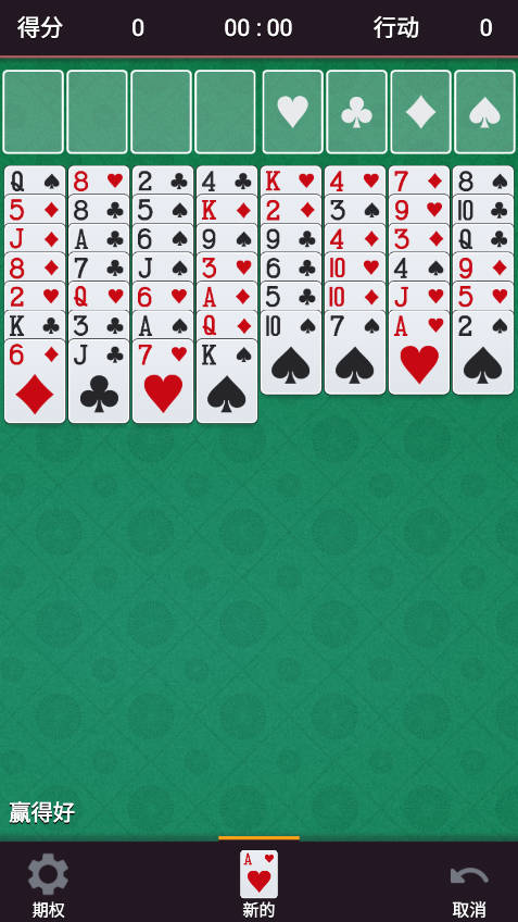 2、玩家的任务是通过移动这些牌来完成目标:将四叠牌按照从A到K的顺序、同花色排列。