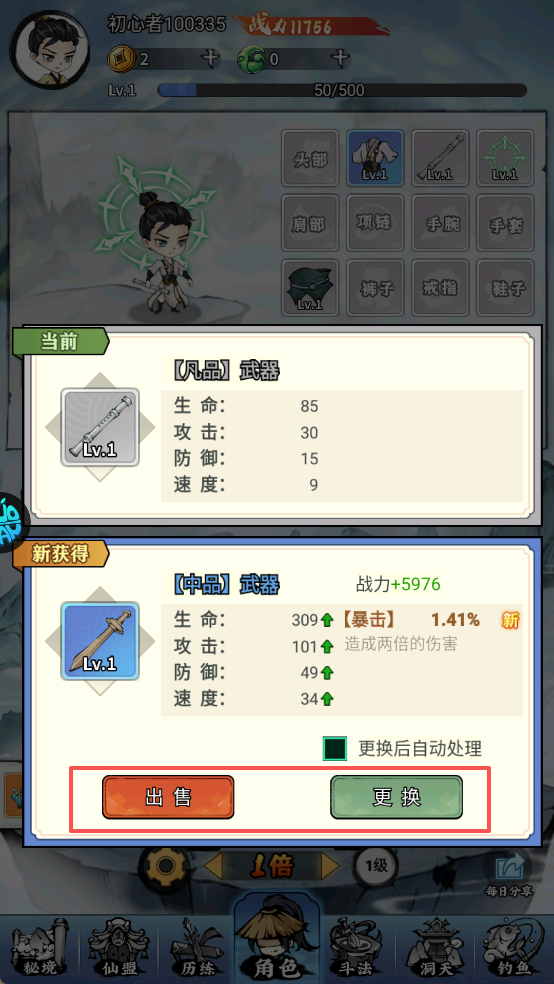 当获得中品武器等高战力装备时,直接【更换】旧装备,淘汰的装备可选择【出售】换取资源,实现循环提升。