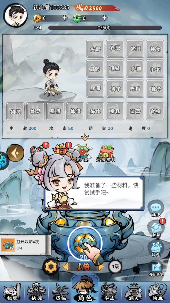 优先在神鼎中点击【开鼎】,快速获取初始装备,这是前期提升战力的关键步骤。