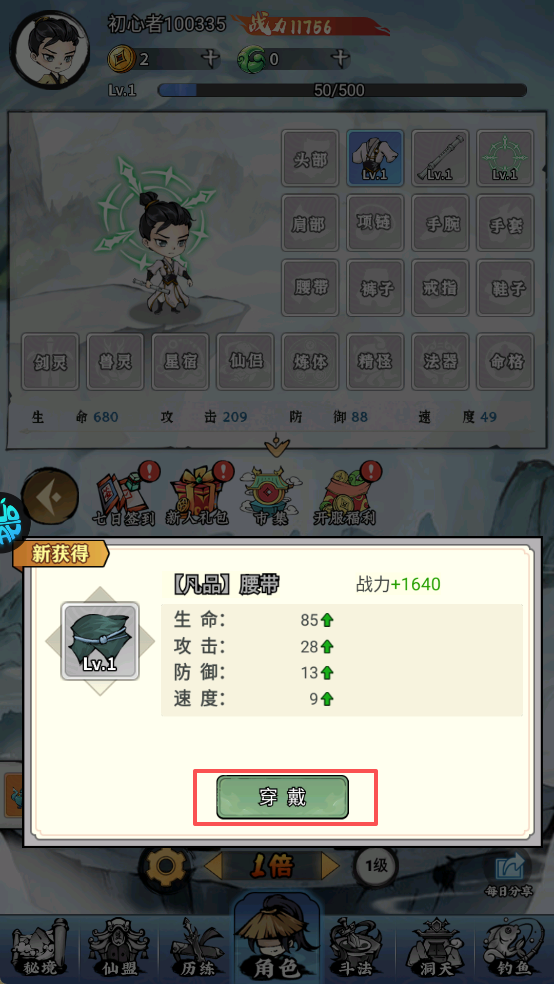 获得新装备后立即【穿戴】,即便是凡品腰带也能直接增加战力,应尽快填满所有装备栏。