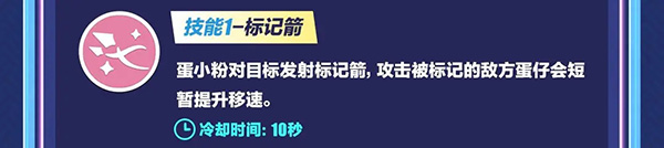 蛋小粉对目标发射标记箭,攻击被标记的敌方蛋仔会短暂提升移速。