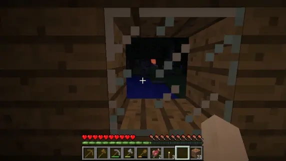 我们把刚刚烧好的玻璃放在提前准备好的窗户处,这样,我们的第一夜就可以在欣赏野外的风光中度过,或者是安安稳稳的在地下开采一晚了!而且,我们可以在以后的发展中进一步改良我们的小小庇护所,这一切都看你的啦!小伙伴们!