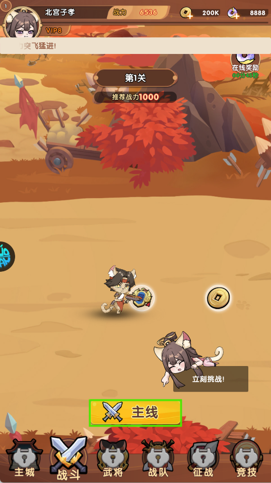 游戏界面会显示推荐战力,直接点击【立刻挑战】即可轻松通关。前期以推主线为核心目标,尽快解锁更多系统玩法,武将等级提升后战力会自然快速增长。