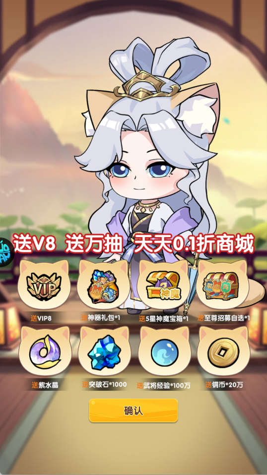 进入游戏后,第一时间领取【送V8+万抽】新手福利。前期获得的紫水晶与突破石建议优先投入主力武将培养;0.1折商城中的资源可在中后期根据需求再行购买,避免前期浪费。