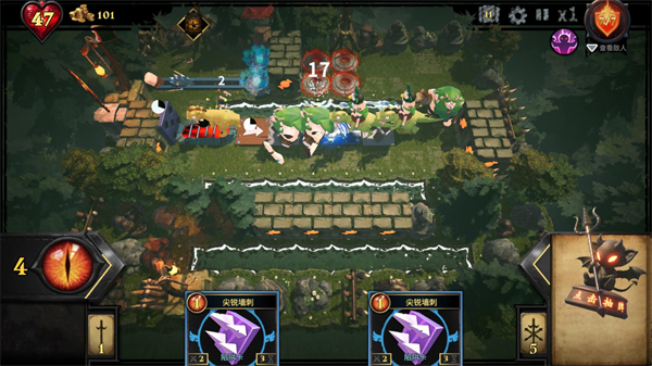 怪物会从红色区域出现并向蓝色区域移动,当它们进入陷阱范围时,陷阱会自动触发攻击。消灭敌人可获得魔眼,用于解锁和使用新的卡牌。