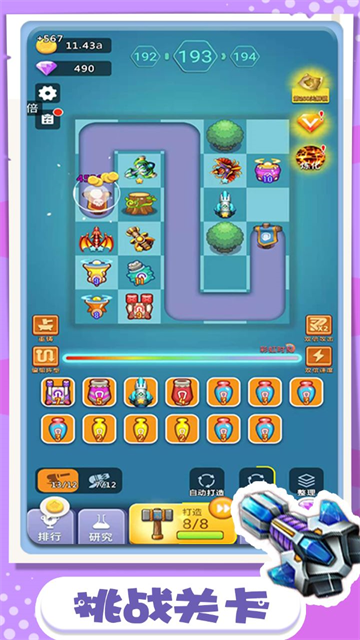 4、通过闯关获得后续进阶材料,不断升级研发炮台,提高炮台威力