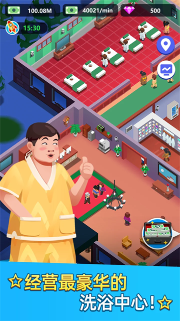 v1.4.8温泉大亨是一款模拟经营类休闲手游,游戏画风采用了休闲的卡通风格,且还有2.5D的独特视角足以令你尽数查看自己店铺的生意状况,玩家需要去通过文案的宣传活动以此来增加自己店铺的流量,温泉大亨在不断的增进优化的洗浴、按摩和足疗等各项设施提供最棒的服务,身为店长的你切记不要忘记扩建更衣柜,接纳更多顾客哦。身为玩家的你在游戏中的核心目标就是需要将小镇的温泉产业去发扬光大,游戏中简单放置的模拟经营过程中不但玩家可以解放玩家的双手操作,而且还有着接地气的洗澡按摩题材,将力求还原生活状态下的真实经历。