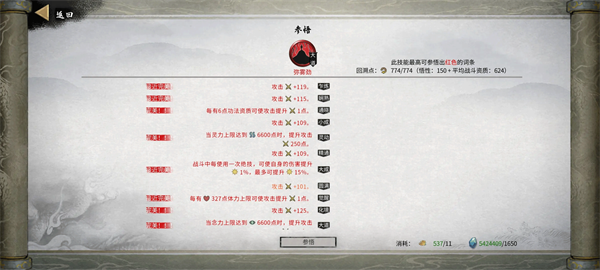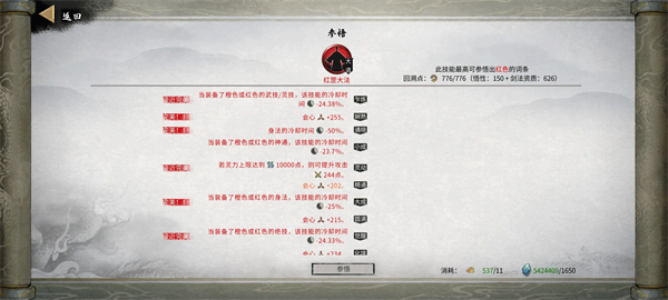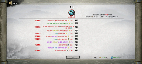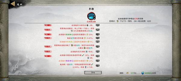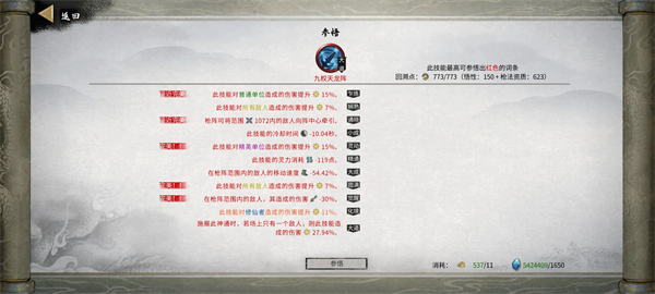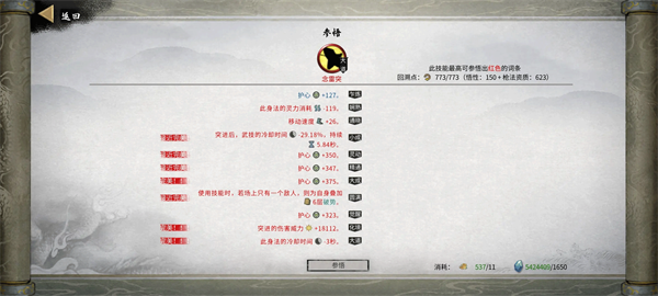 强化选择:3个减武技CD,两个概率(破势武技概率比较低),绝技需求数减少(羽化中后期也强化这个),使用飘渺之力后伤害暴击有50%概率为绝技充能,飘渺之力持续时间+2s。