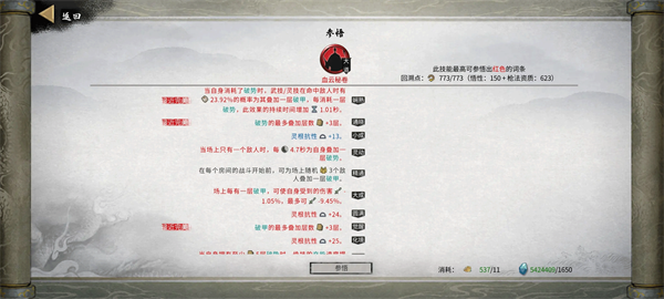 灵力消耗减少,破势提升伤害,概率获得充能,消耗破势减伤,减CD。