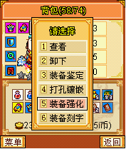 先进入背包选择准备进行强化的装备,点击菜单,选择装备强化。