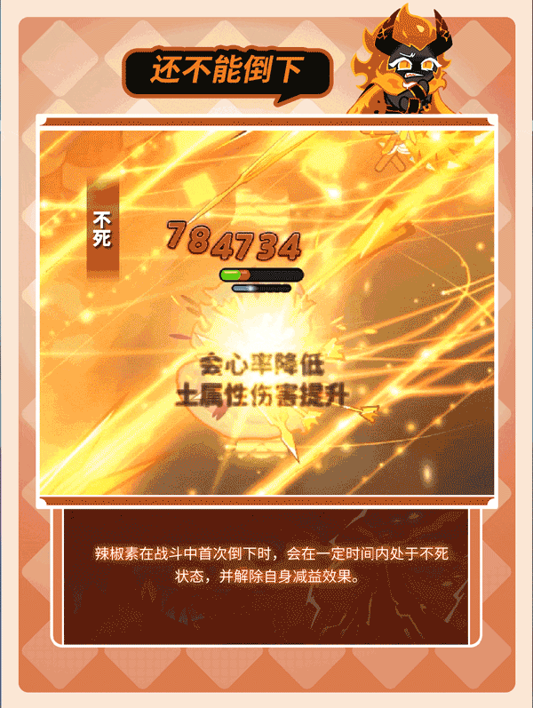 3、当辣椒素饼干首次倒地时,会在一定时间内处于不死状态,并解除自身减益效果。辣椒素饼干在首次进入战斗时,可以快速发动技能。