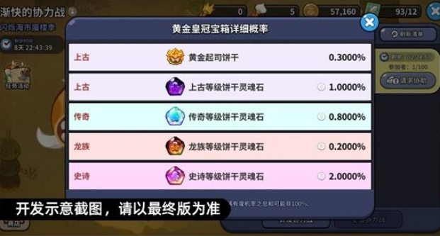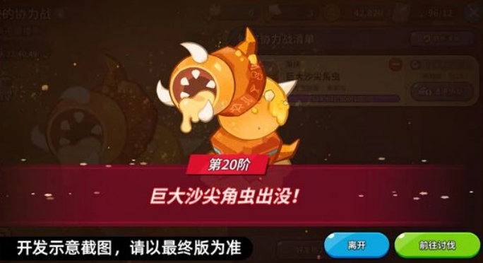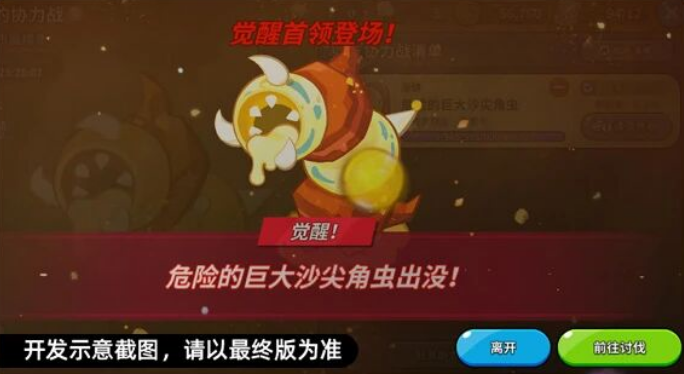 在冒险玩法中均有概率开启协力战玩法,每次击败登场的巨大沙尖角虫后,下一次出现的巨大沙尖角虫会更强!完成协力战后可以获得金币,金币可以用来兑换宝箱,宝箱中有概率获得黄金起司饼干与饼干灵魂石等各种奖励。