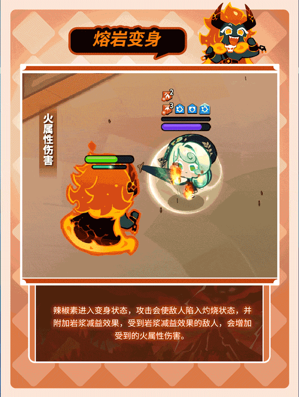 1、开始变身,接下来的攻击会使敌人陷入灼烧并赋予岩浆减益效果,受到岩浆效果的敌人所受到的火属性伤害会增加。