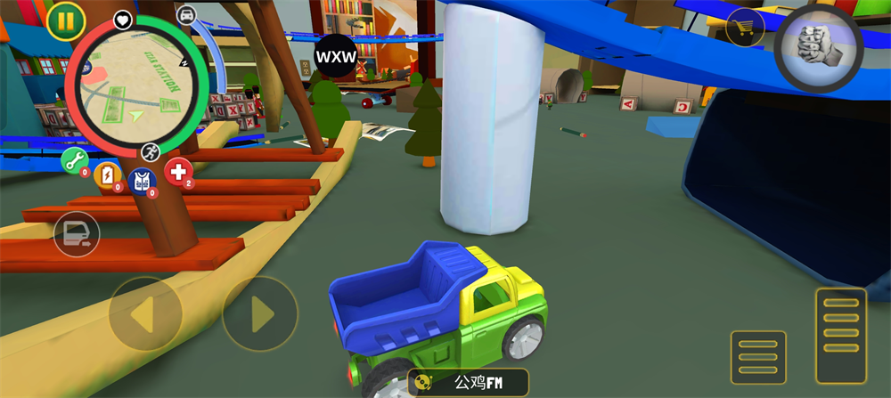 3、场景内还有多种类型的玩具载具,可以任意选择自己喜欢的车驾驶,左右键操纵车的方向,右下角分别是刹车和前进。