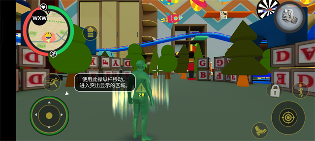 1、进入游戏后,点击左下角轮盘控制角色自由移动,滑动屏幕可以调整视角。