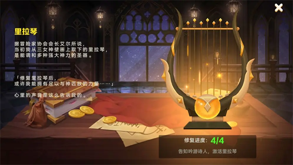冒险者们在通过主线【第4节 修复里拉琴】之后,可以获得里拉琴的最后一个碎片,完成【里拉琴】的修复。