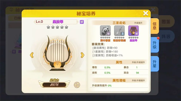 选择【里拉琴】,可以看到该【秘宝】拥有的三圣庇佑、属性及属性增幅。