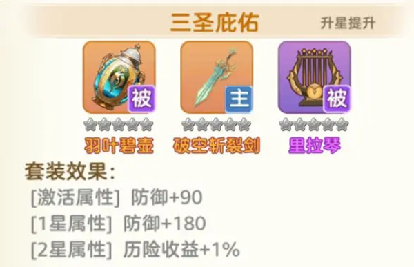 【三圣庇佑】分为三件秘宝组成一个套装,当同时拥有套装里的三件秘宝时,就可以激活套装效果。