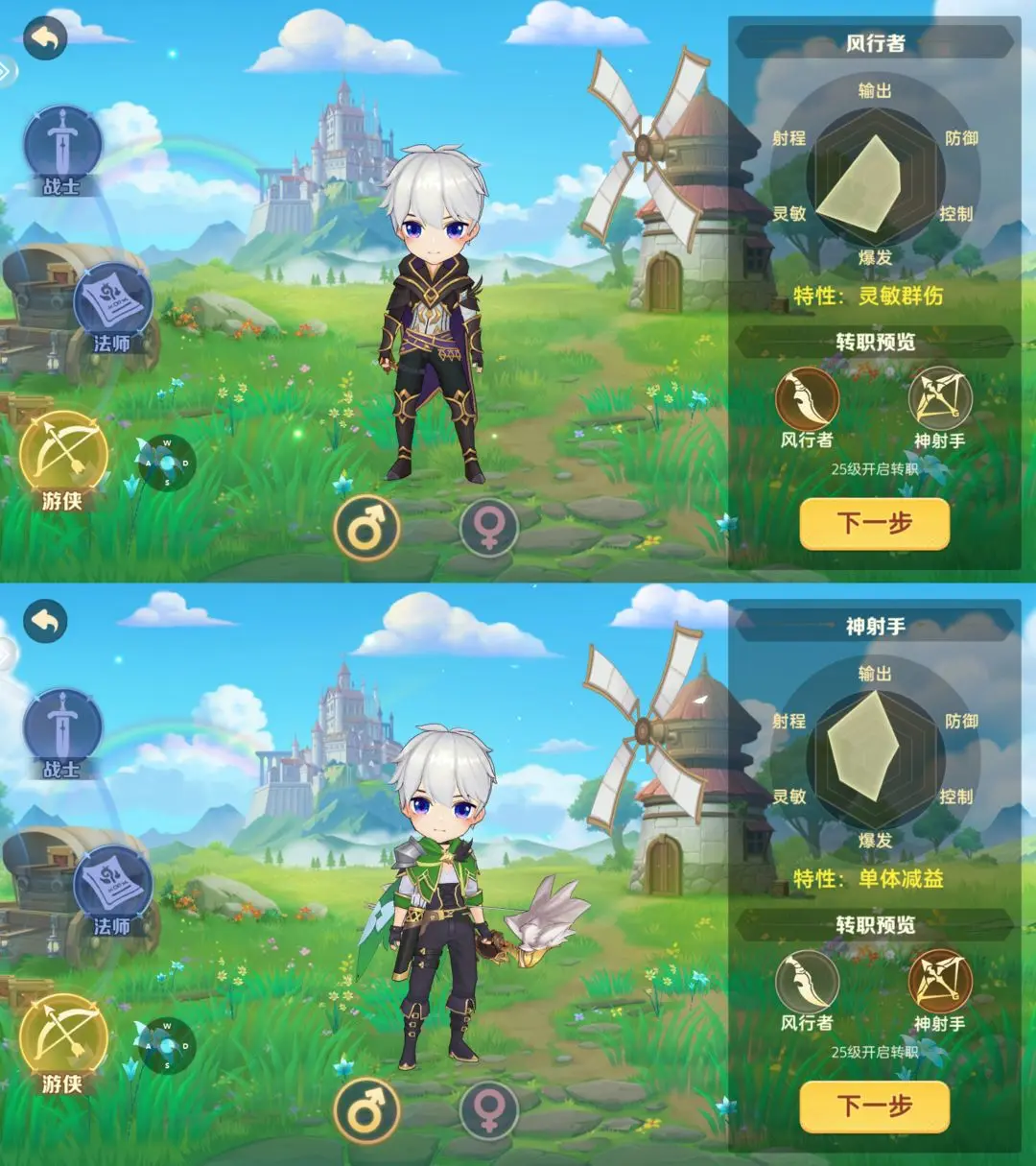 游侠转职:风行者(灵敏群伤)、神射手(单体减益)