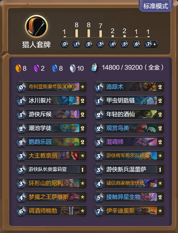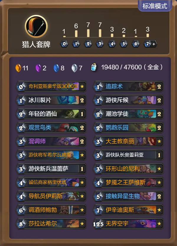 常规起手留牌:甲虫钥匙链(快),追踪术,鹦鹉乐园,大主教奈利,游侠新兵温蕾萨。先手可选择性保留观赏鸟类,后手有鹦鹉乐园可留导航员伊莉斯。有前期节奏的情况下,可选择混调师和环形山的尼利一起保留。