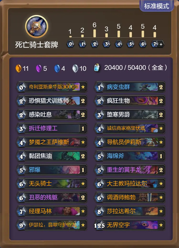 补丁后的节奏DK,在舍弃了龙群先锋火龙体系后,转而通过无头骑士与马林补充后期质量。四费曲线则补充了黏团焦油,以弥补血虫感染的节奏缺失,在面对环境中较多的中速萨和发现猎时也能够在前期护脸实现场面交换。