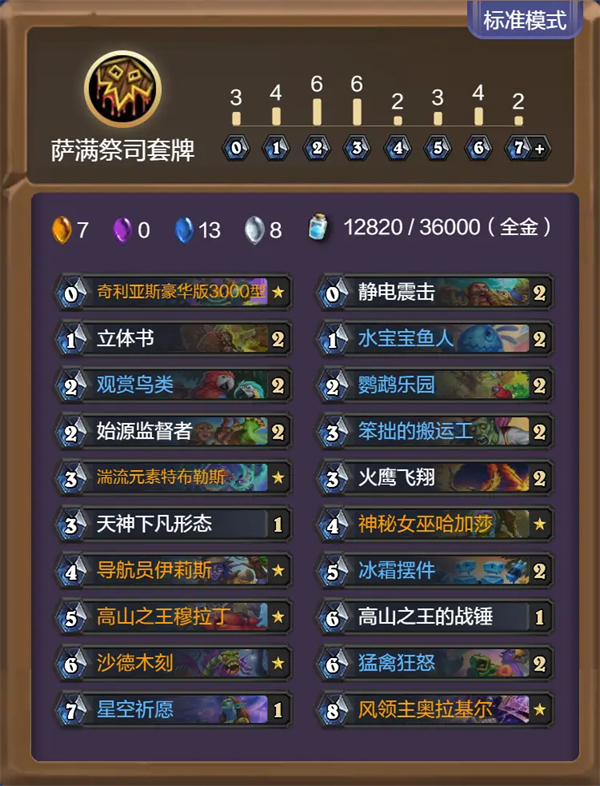 中速萨是一套依靠随从buff与场面交互获胜的卡组,对局核心思路需以 “抢节奏” 为第一优先级,主打先手压制打法。前期通过buff手段全力检索笨拙的搬运工拿到场面优势,中期通过哈加莎或伊莉斯扩大场面与手牌资源,后续通过与沙德木刻的三倍战吼的配合实现场面的平推或利用穆拉丁拉出高山之王的风怒战锤,配合猛禽狂怒与风领主奥拉基尔补充伤害终结游戏。