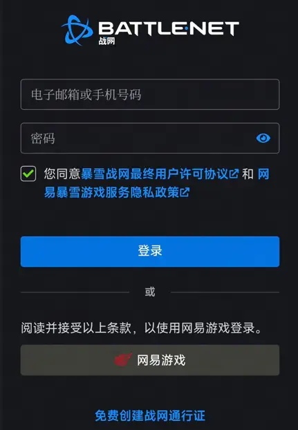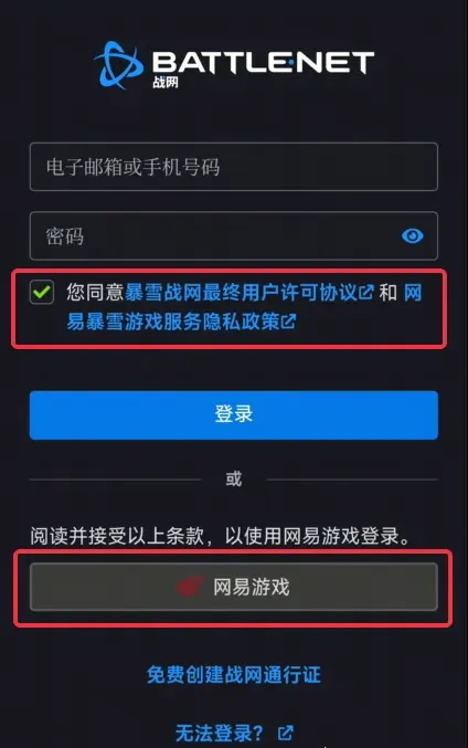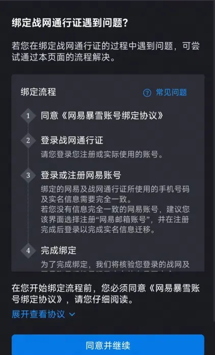 2.登录网易账号,请注意:新注册网易账号的绑定手机号码需要与待绑定战网通行证手机号码相同,新注册网易账号与待绑定战网通行证的实名信息需相同,阅读绑定协议同意并继续。
