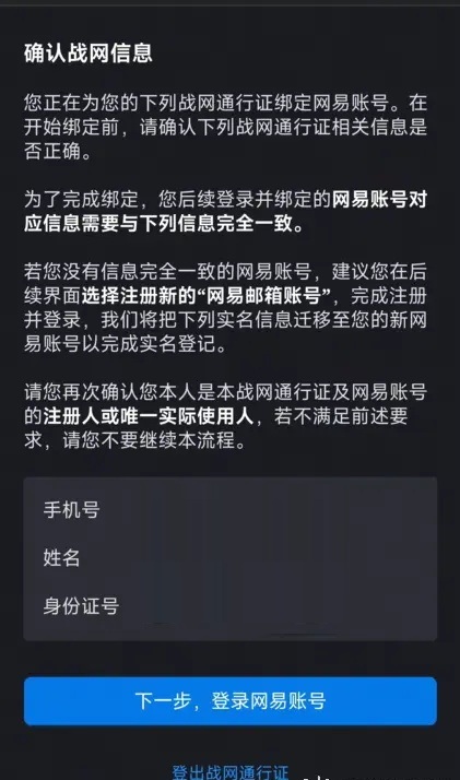 5.确认需要绑定的战网通行证信息,点击下一步,登录网易账号