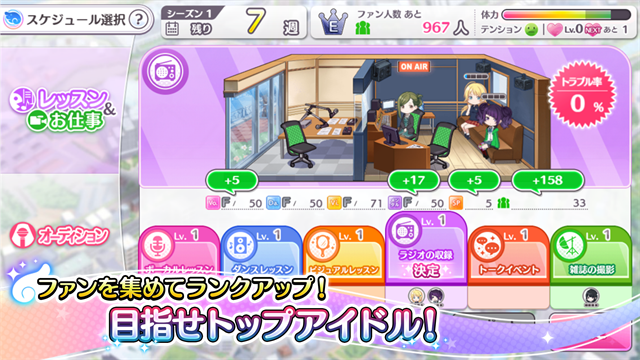试镜共有三种。建议大家别参加难度最低的一个。这是因为每一次试镜都会导致一周时间过去,而每次升级期限却只有短短八周。难度最低的一个获取的粉丝数极少,要挑战约4-5次左右才能获取升级要求的粉丝数。反而,难度第二的只需要进行2次,最高难度的只需要1次。故此不建议挑战最低难度的试镜,宁可把时间用作训练偶像上。