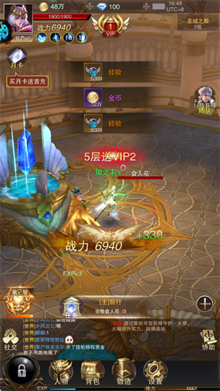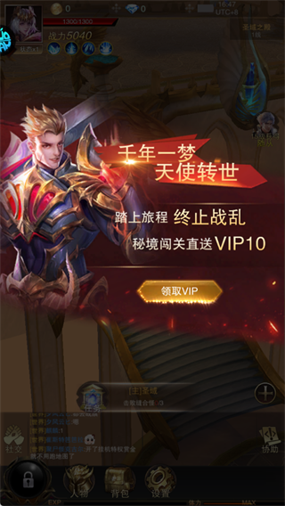 游戏上线先点击“领取VIP”,参与秘境闯关,免费冲V10解锁特权。