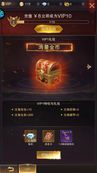 可先领取礼包获取钻石、经验药水等资源,充值8元即可秒升V10。