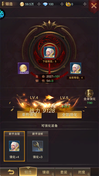 使用金币强化装备,可选择单件或全部强化,快速提升战力。