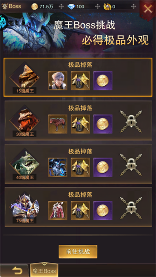 魔王挑战可掉落随从等珍贵道具,点击“前往挑战”获取资源。