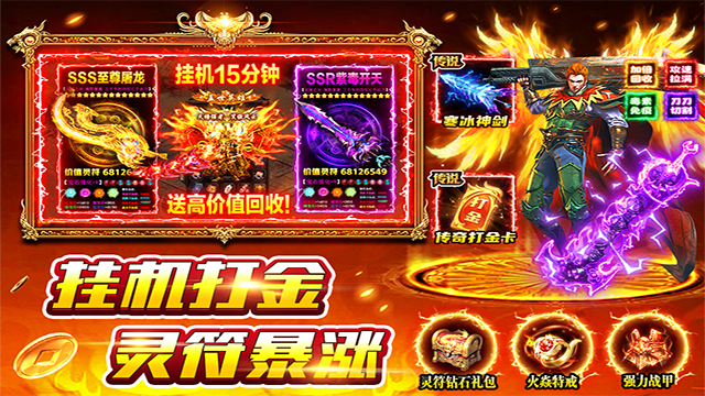 野外地图、副本、BOSS全开放掉率,小怪也能爆顶装。挂机刷副本轻松获取神装和灵符。