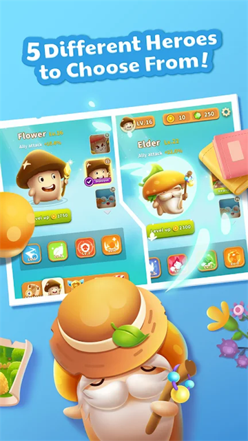8、5个特色蘑菇英雄,各带不同技能,任你挑选。
