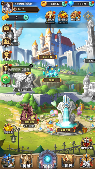 在主界面,优先参与“英雄召唤”补强阵容,再通过“副本挑战”“限时挑战”获取养成材料。