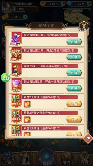 通过GM工具快速解锁2倍/4倍战斗速度、一键寻路等特权,还能领取代金券兑换稀有道具。