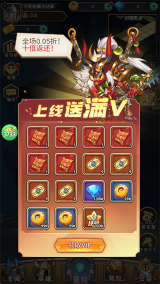 开局直接领满V+海量资源,点击“领取VIP”一键解锁T0战神等福利,直接满配起步。