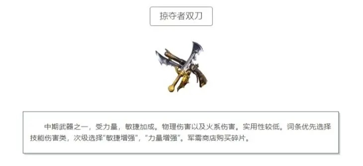 掠夺者双刀是中期的另一把武器,受力量和敏捷加成,具有物理伤害以及火系伤害,实用性较低。词条优先选择技能伤害类,次级选择“敏捷增强”和“力量增强”。掠夺者双刀的碎片可以在军需商店购买。